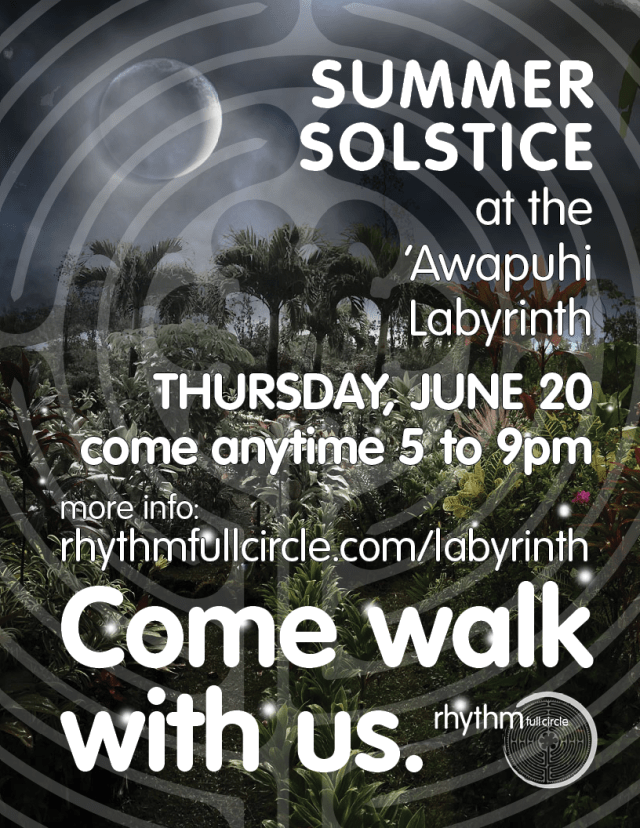 My name is Deborah Masterson; I am the caretaker of the โ€˜Awapuhi Labyrinth on the Big Island of Hawaiโ€˜i. I'm also a certified advanced TaKeTiNa Rhythm teacher. My fascination with the mystery and power of rhythm was ignited when in 1988 I attended a Samulnori concert. For many years, I concentrated on Korean percussion and dance, both in Honolulu and in Korea. Over the intervening years, my explorations have included West African dundun, Afro-Cuban and Congolese congas, dumbek, frame drum, and classical Indian music. But these days I am into painting! Click on ART! in the main menu.