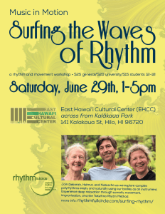 I’m excited to join two visiting TaKeTiNa colleagues, Helmut and Natascha from Berlin, who are offering a rhythm and movement workshop at East Hawai‘i Cultural Center on Saturday, June 29.
