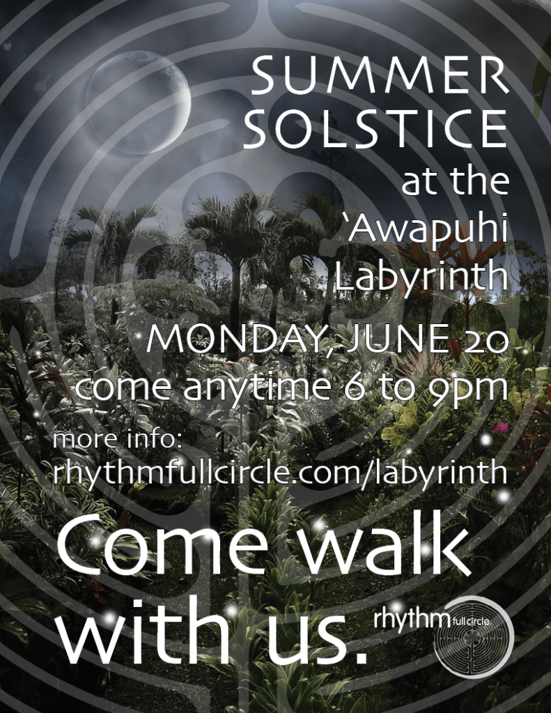 My name is Deborah Masterson; I am the caretaker of the โ€˜Awapuhi Labyrinth on the Big Island of Hawaiโ€˜i. I'm also a certified advanced TaKeTiNa Rhythm teacher. My fascination with the mystery and power of rhythm was ignited when in 1988 I attended a Samulnori concert. For many years, I concentrated on Korean percussion and dance, both in Honolulu and in Korea. Over the intervening years, my explorations have included West African dundun, Afro-Cuban and Congolese congas, dumbek, frame drum, and classical Indian music. But these days I am into painting! Click on ART! in the main menu.