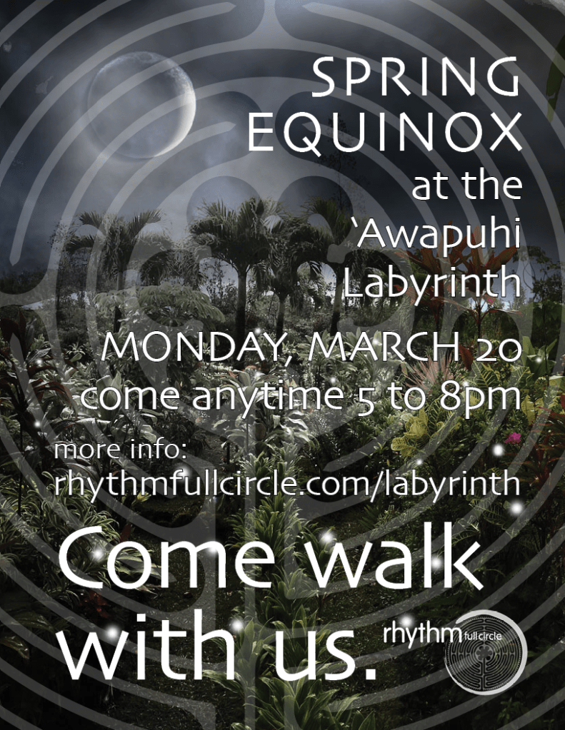 My name is Deborah Masterson; I am the caretaker of the β€˜Awapuhi Labyrinth on the Big Island of Hawaiβ€˜i. I'm also a certified advanced TaKeTiNa Rhythm teacher. My fascination with the mystery and power of rhythm was ignited when in 1988 I attended a Samulnori concert. For many years, I concentrated on Korean percussion and dance, both in Honolulu and in Korea. Over the intervening years, my explorations have included West African dundun, Afro-Cuban and Congolese congas, dumbek, frame drum, and classical Indian music. But these days I am into painting! Click on ART! in the main menu.